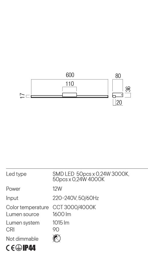Aplică pentru interior cu protecție la umiditate, echipată cu LED-uri SMD, cu posibilitate de selectare a temperaturii de culoare a luminii, structură din metal și aluminiu vopsită în câmp electrostatic în culoare negru mat, dispersor din silicon opal.
