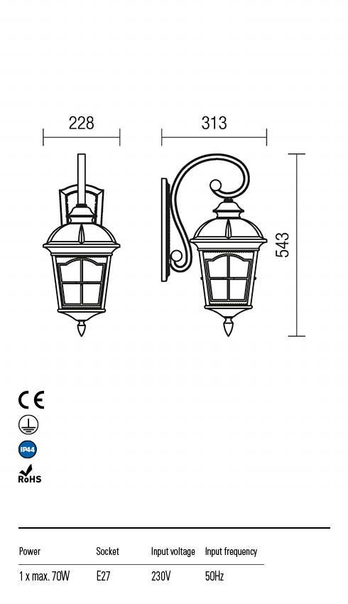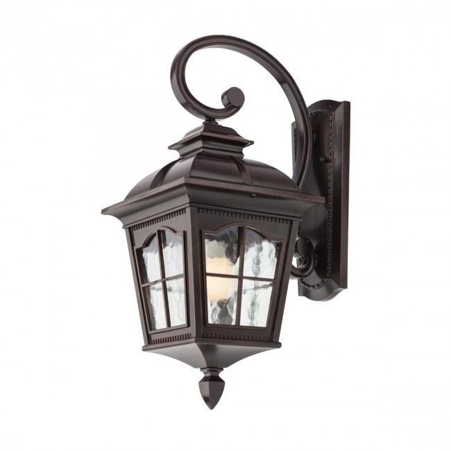 Aplică pentru exterior, corp din aluminiu turnat sub presiune finisat negru antic cu patină maro, dispersoare din sticlă decorativă tip “Waterglass”.