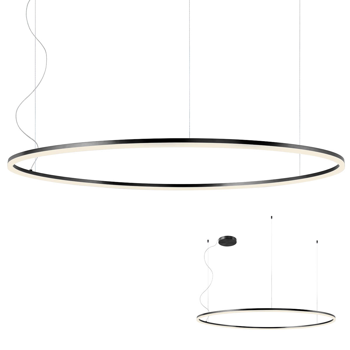 Suspensie pentru interior echipată cu LED-uri SMD, structură din aluminiu și metal vopsită negru mat, dispersor din acril alb satinat.
