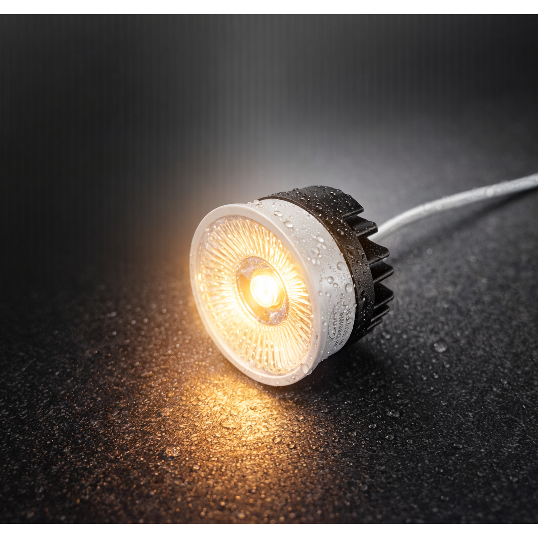 Modul cu LED, pentru montaj la interior si in bai (IP54), cu lumina directa. Utilizat impreuna cu spoturile cu dulie GU10, cand adancimea nu permite montajul becului. Structura din aluminiu turnat vopsit in camp electrostatic, finisaj alb mat, radiator negru. Excelenta claritate a luminii si redare a culorilor (CRI90). Alimentator atasat cu cablu.